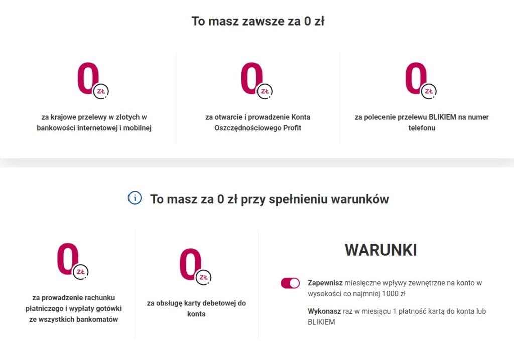 Jeśli nie spełnisz warunku wpływu na konto 1000zł (może być z innego Twojego konta) i płatności kartą lub BLIKiem w danym miesiącu to zostanie naliczona opłata 15zł za prowadzenie konta.
