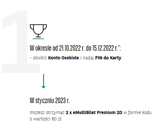 Wystarczy, że otworzysz konto i wyrobisz kartę do konta i już w styczniu 2023 roku otrzymasz eKod do kina na 60zł. Jeśli w grudniu 2022 uzyskasz wpływ na konto (np. z innego swojego konta) 1000zł i zrobisz przelewy na co najmniej 300zł to w styczniu przelewem na konto uzyskasz pierwsze 200zł premii.