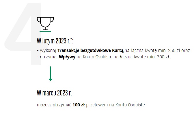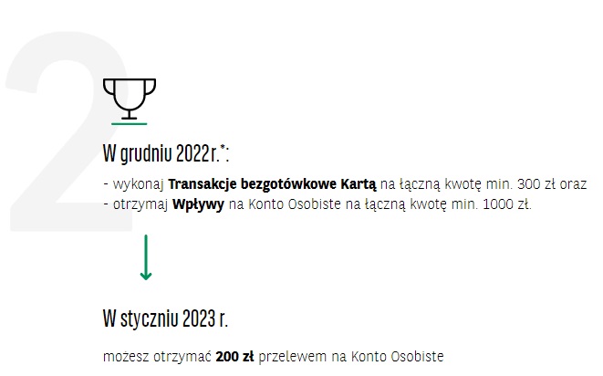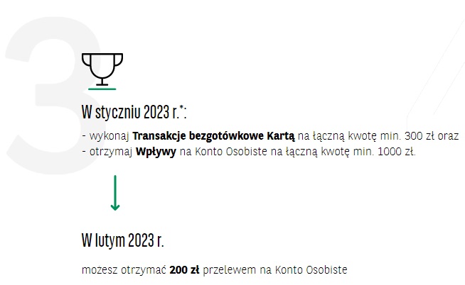 Jeśli w styczniu 2023 uzyskasz wpływ na konto (np. z innego swojego konta) 1000zł i zrobisz przelewy na co najmniej 300zł to w lutym przelewem na konto uzyskasz kolejne 200zł premii.